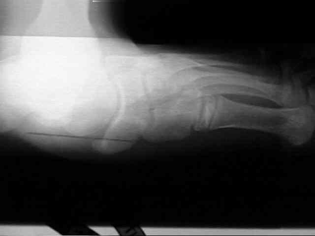 tibialis posterior tendon is attached to plantar surface of navicular by suturing remaining wafer of bone to undersurface of the navicular, w/ part of the forefoot in inversion;